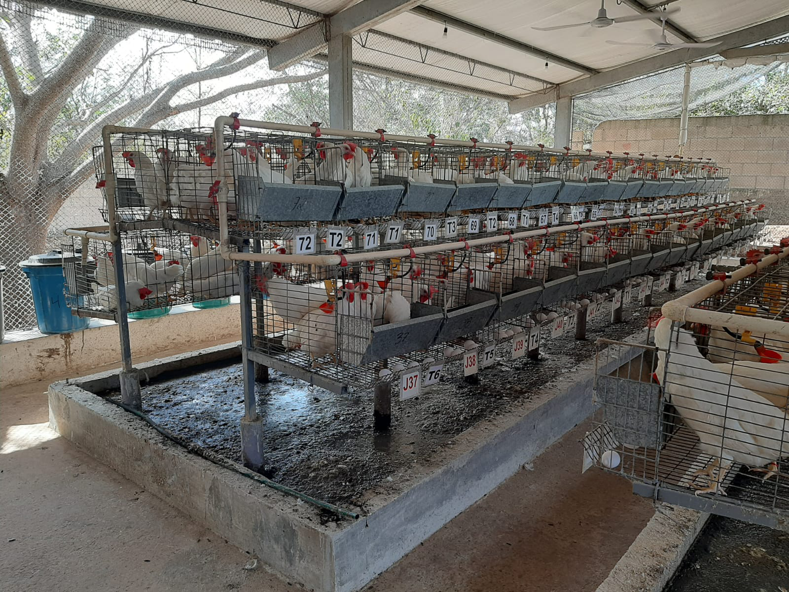 This module has 156 cages to accommodate 10 birds per cage, distributed in three two-level pyramids. Each pyramid is arranged in 4 rows with 13 cages each and a total of 52 cages per pyramid. Considering the number of birds, the type of facility and our location, the houses simulate the particular characteristics of a commercial farm in the tropics.